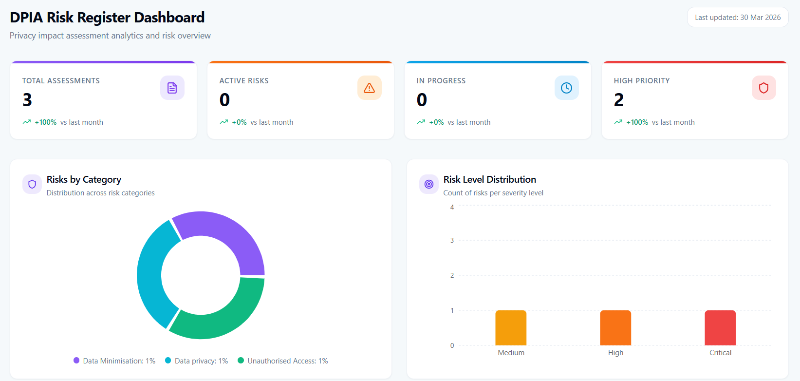 Generate the complete DPIA Assessment Report and Risk Register Report on demand — capturing every answer, decision, risk entry, mitigation action, and closure approval. Regulator-ready from the moment it's produced.