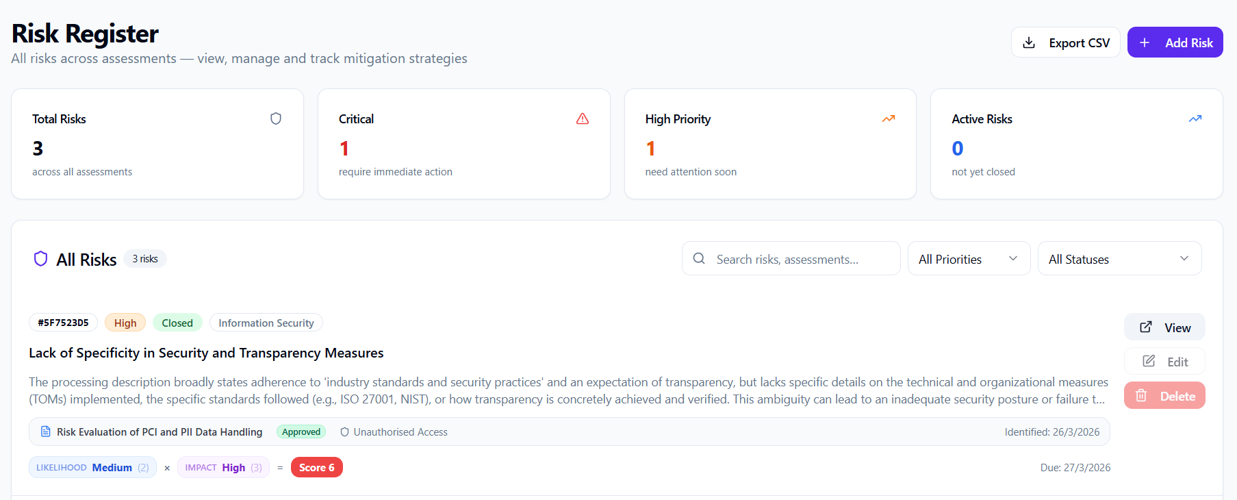 Unlike static documentation, every register entry is a live record — linked to its source question, scored on a 3×3 matrix, assigned through a governed workflow, and tracked until closure or documented acceptance.